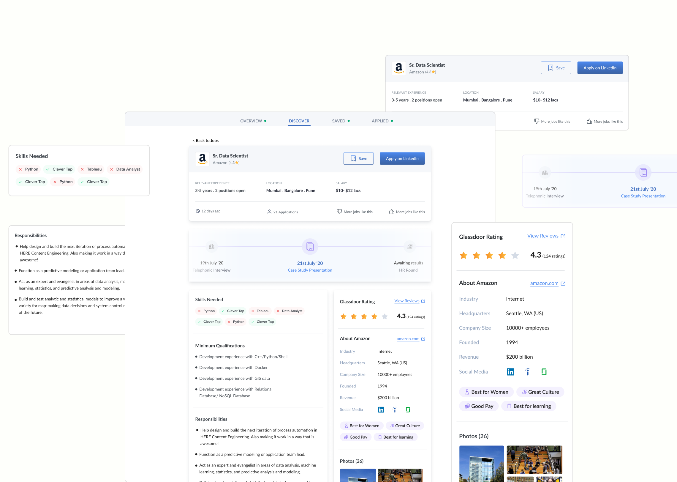 We created a job details page which provided for deep validation and guidance. You can quickly skim whether your skills are a fit and realise where you should focus your learning behaviour towards. Understanding the factors needed to succeed in the interview and the job not only helped in getting a better transition, but also made learning focused on market requirements.