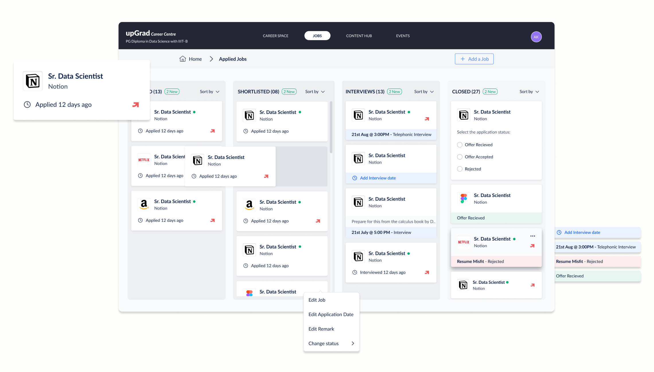 A kanban board, connected with the details page, combined an ability to add remarks made the entire job hunting process smooth and efficient, resulting in a massive jump in conversions.