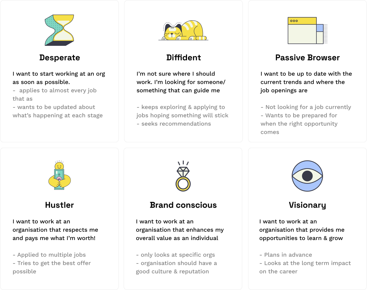 We worked with users from different regions and work experience to zoom out and understand their career motivations across life spans and also zoom in to their current ways in which they would go about fulfilling the task. The users were in a way representative of the Maslow’s hierarchy - it is surprising in how it relates back to the way one looks towards the purpose of their work.