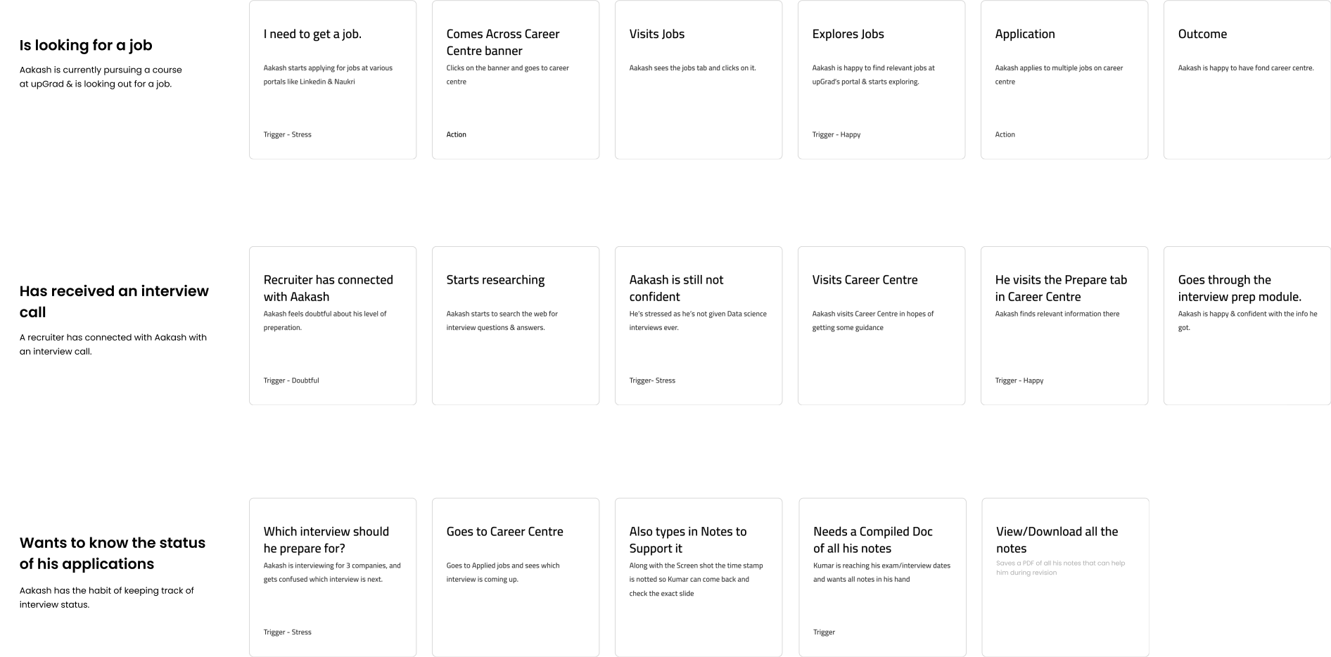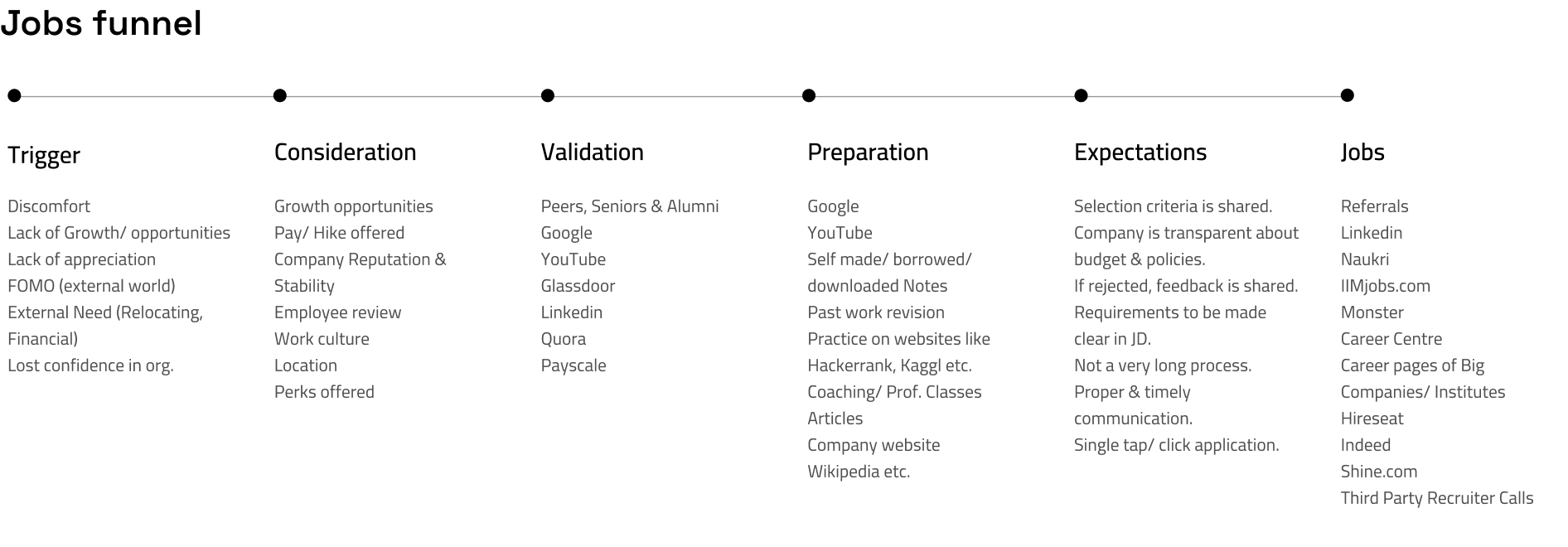 • We storyboarded the funnel, socialising w/ teams to help elucidate the user’s journey across various stages of job search.